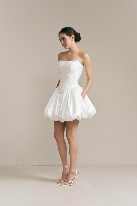 Ivory Short Wedding Dress: Satin Elopement Gown with Lace Sleeves