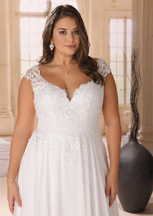 Plus Size Chiffon A-Line Wedding Dress with Cap Sleeves and Lace Appliqué
