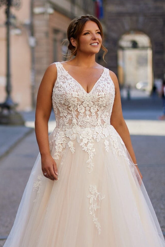 Plus Size Lace A-Line Wedding Dress with Double V-Neck & Beading