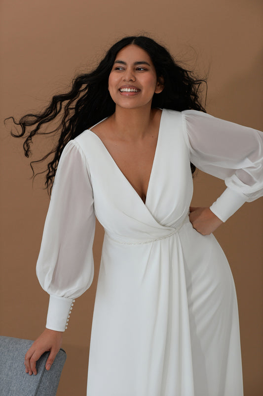 Plus Size Chiffon Pleated A-Line Wedding Dress with Long Sleeves & V-Neck