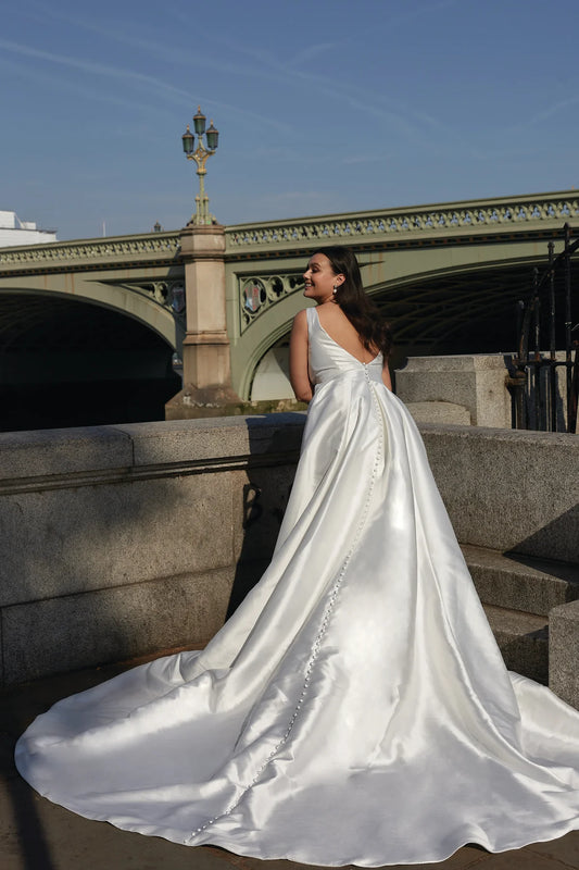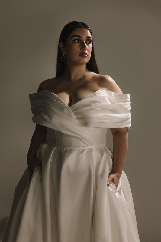 Plus Size Off Shoulder Satin A-Line Wedding Dress with Pockets & V-Neck