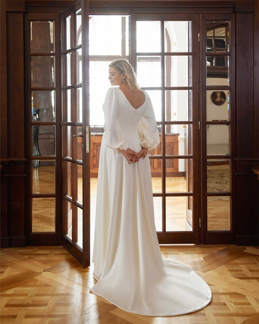Plus Size Satin A-Line Wedding Dress with Puff Sleeves