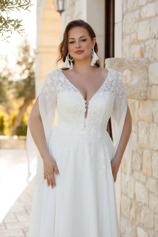 Plus Size Chiffon V-Neck Wedding Dress with Lace Appliqué & Flowing Sleeves