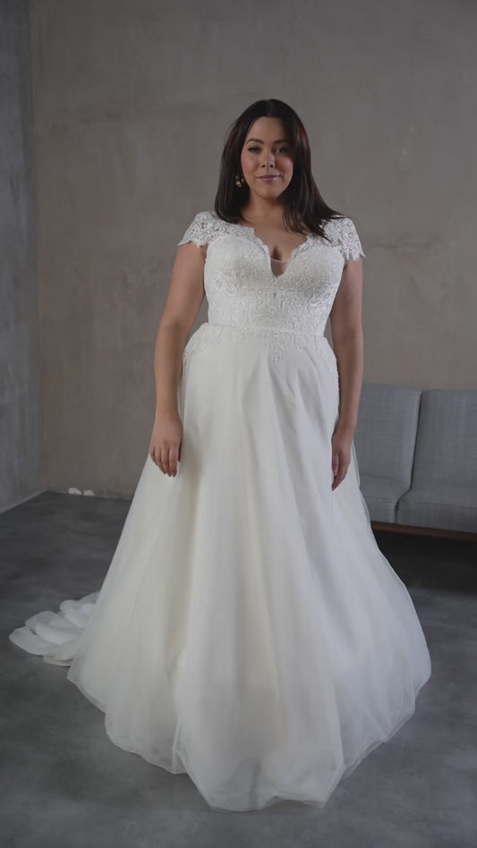 Plus Size Lace Wedding Dress with Cap Sleeves, V Neck & Sweep Train