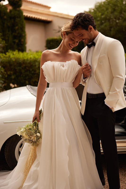 Tulle Basque Waist Wedding Dress: Ruffle Bodice, Long Sleeves